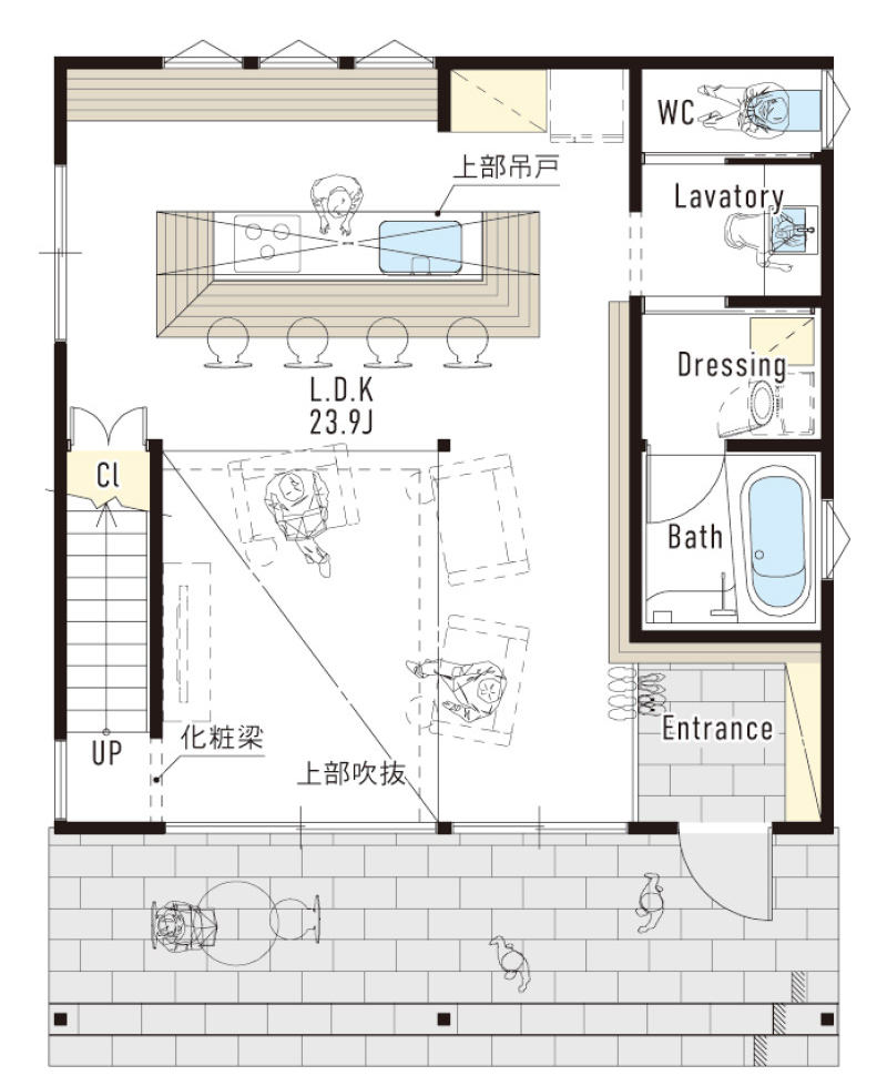 親しい人たちを招いてお茶会や食事会など、さまざまなシーンに対応可能なクラシカルなスタイルの家です。テラスによって室内外がゆるやかにつながり、アイデア次第で色々な楽しみ方が可能に。開放的な空間はコミュニティの中心になることが期待できます。